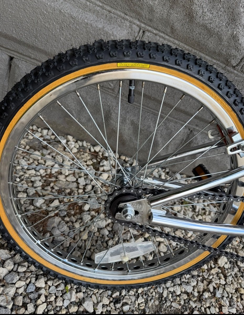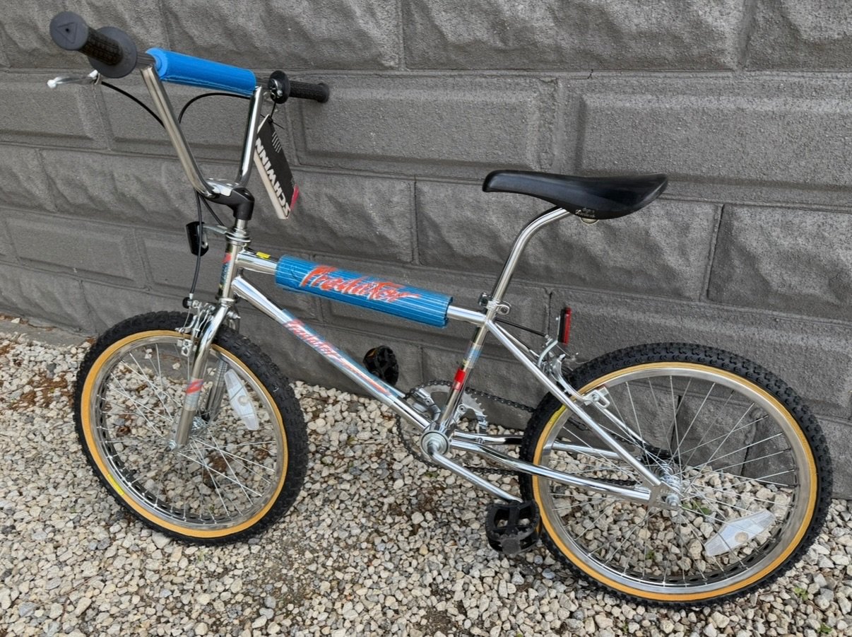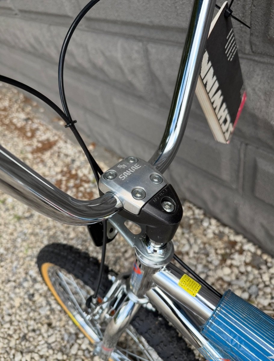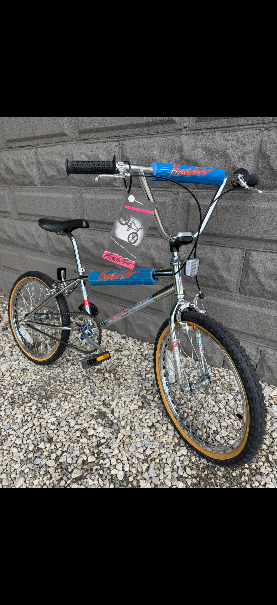 1985 Predator Streetwise. #GO285 Original decals. Original Pro Class wheels, yellow label competition tires. Pro Class MX brakes, front and rear. Mx Lee Chi levers. SR Sakae MS 423 stem. CW style bars, Ame grips. Sugino crank, Sugino spider, SR SP-518 Japan stamped Pedals. Black Dyna Viscount seat. Mx clamp and chrome fluted seat post. Original reflectors, Predator Pad set and owners manual. Super clean survivor. Chrome is beautiful. Pro class brakes