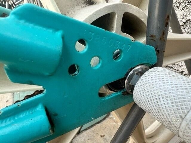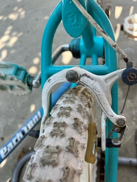 Braking is handled by Dia Compe – Nippon front and rear brakes with matching Dia Compe tech brake levers, while the Skyway Mags offer vintage style with small stress cracks, maintaining original character. Additional highlights include rear pegs, FS seat clamp, and a rare sprocket clock, making this bike truly unique for collectors.